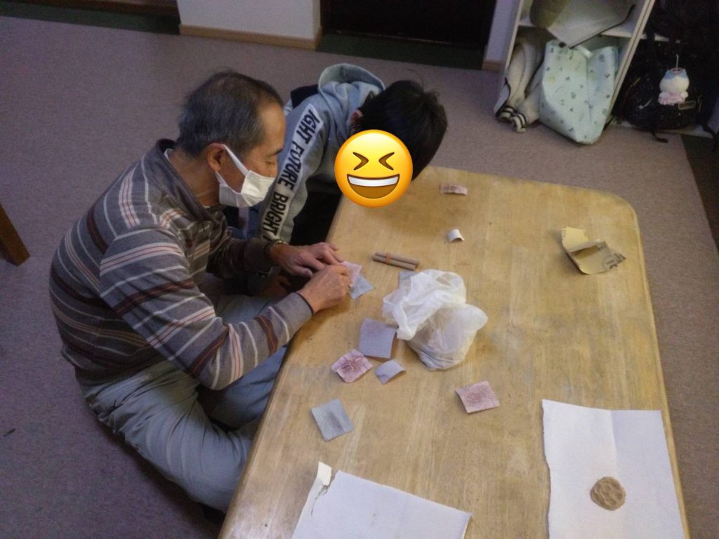 今日は握りやすいように紙ヤスリで削ったり、色を付けたりと各々デザインを考えて作りました。